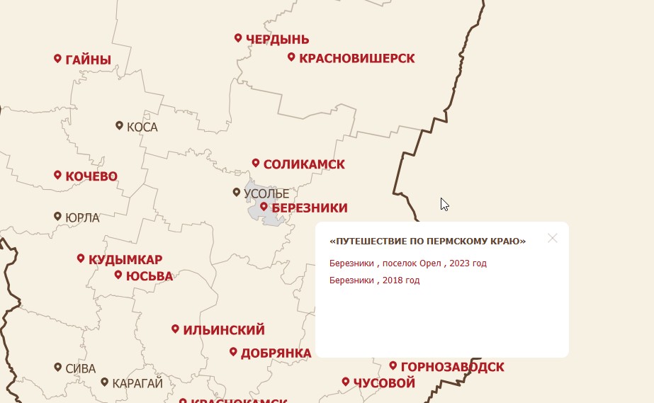 При наведении на название административного центра муниципалитета появляется список фильмов с указанием населенного пункта и годом съёмки. В разные годы они проходили в 35 из 43 муниципалитетов, были сняты фильмы о деревнях, сёлах и городах Прикамья.