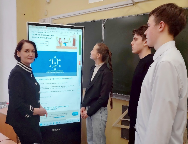 Школьники показали депутату огромную, в рост человека сенсорную панель с выведенной на неё информацией. Вместе с ними Светлана Карташева протестировала комплекс, оснащённый простым и удобным интерфейсом.