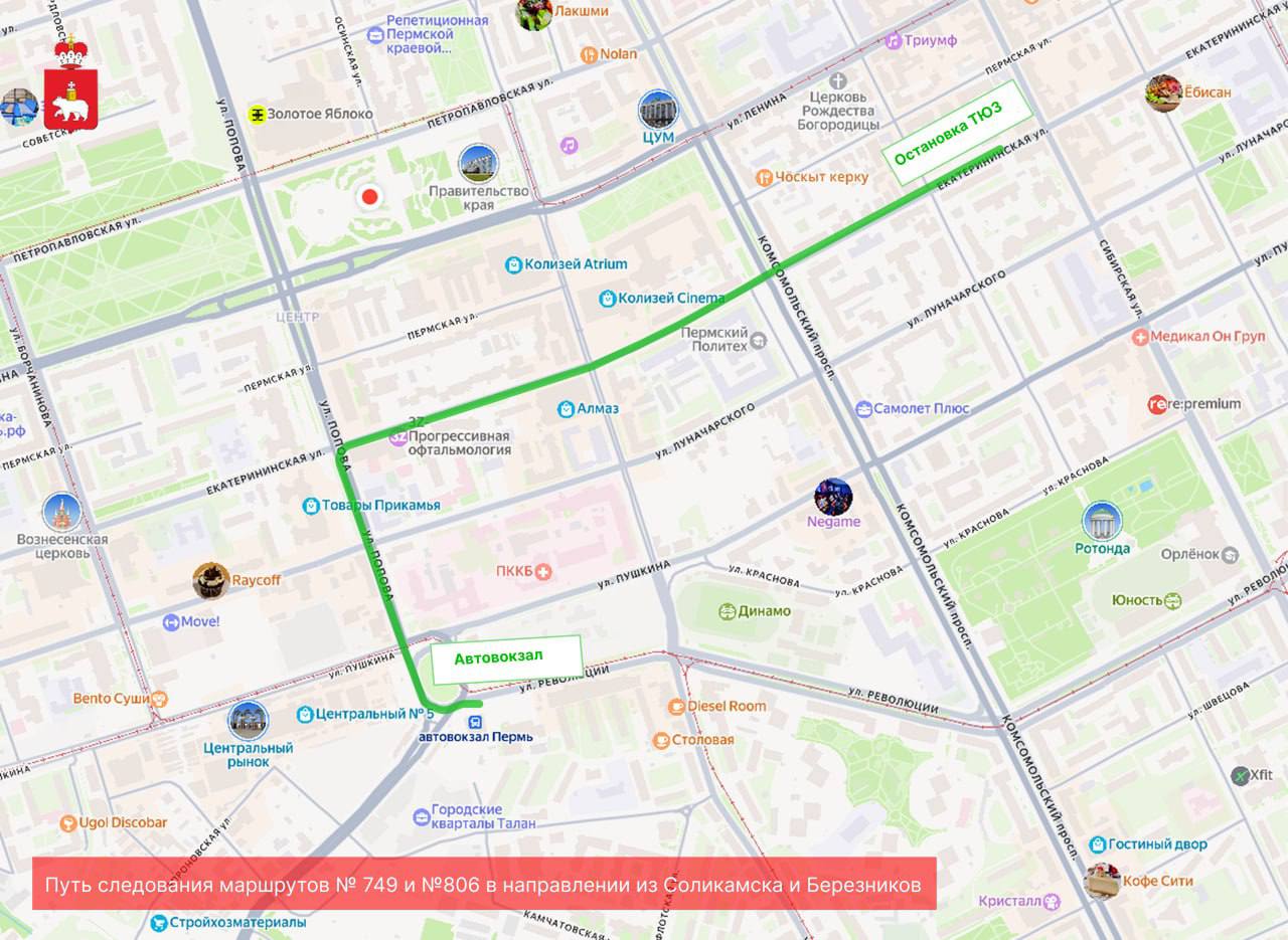 После въезда в Пермь автобусы проследуют по улицам Екатерининская, Попова и Революции и прибудут прямо на автовокзал Перми, минуя остановки «Трансагентство» и «Пермь‑2». В обратном направлении, из Перми в Соликамск и Березники, схема движения останется прежней, пассажиры по‑прежнему смогут пользоваться привычными рейсами по действующему расписанию.