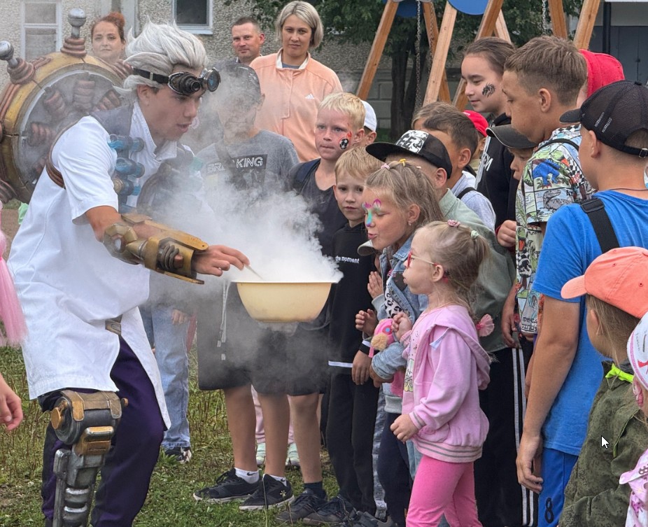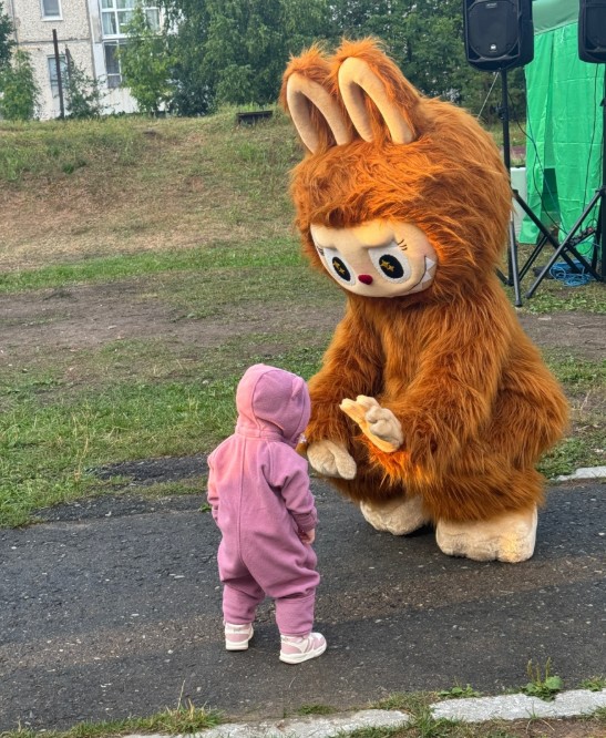 Тем временем дети уже вовсю играют с весёлыми персонажами.В гостях у ребят побывали «крейзи-учёный» (на фото), человек-шар, капибара и даже модный персонаж Лабубу.