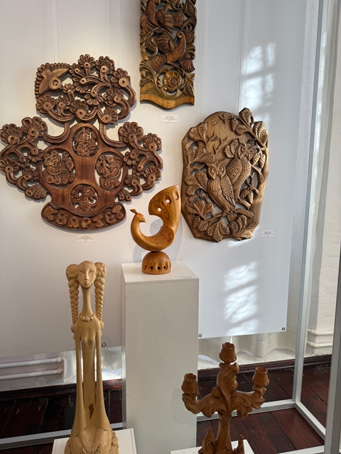 В ограниченном пространстве выставочного зала – многообразие жанров и форм: начинающие мастера смело экспериментируют с формой и содержанием. На выставке представлены студенческие работы разных лет. Здесь можно увидеть все направления, по которым ведут обучение в колледже – ювелирное мастерство, скульптуры малых форм из мягкого камня, художественные изделия из керамики и дерева, горячая эмаль и ткачество.