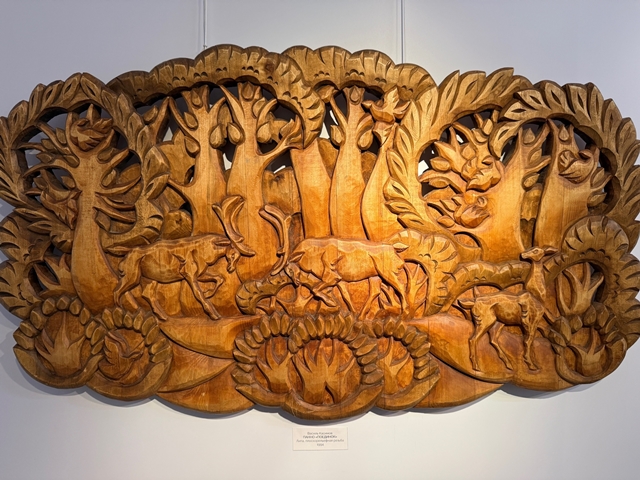 Ещё один выставочный экспонат – плоскорельефное резное деревянное панно авторства Василя Касимова: на поляне густого леса сошлись в поединке два рогатых красавца, готовых в бою доказать свою мощь и силу.