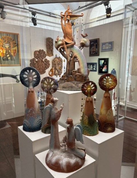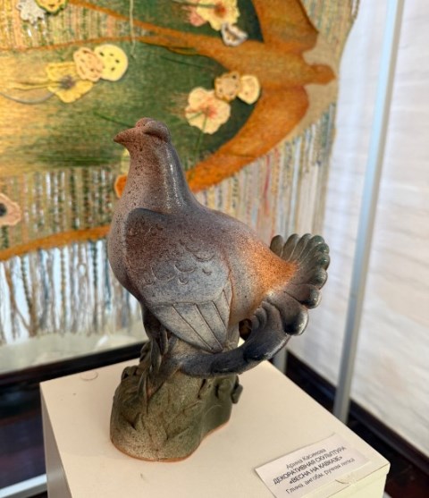 Хочется рассматривать и разнообразные по форме вазы, вылепленные вручную и покрытые глазурью. К примеру, ваза «Анютины глазки» пробуждает воспоминания о цветах и красках лета. Есть на выставке и сложные декоративные композиции из глины, которые дают простор фантазии, и предметы прикладного творчества, например, светильники в виде причудливых рыб.