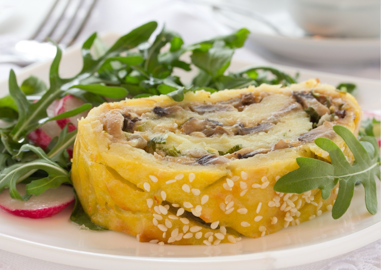 Корж остудите, снимите с бумаги, переверните, посыпьте натёртым сыром, обжаренными с луком грибами и нарезанной ветчиной. Полейте рулет соусом. Сверните картофельный корж с начинкой рулетом и поставьте ещё на 15 мин. в духовку, чтобы сыр расплавился.