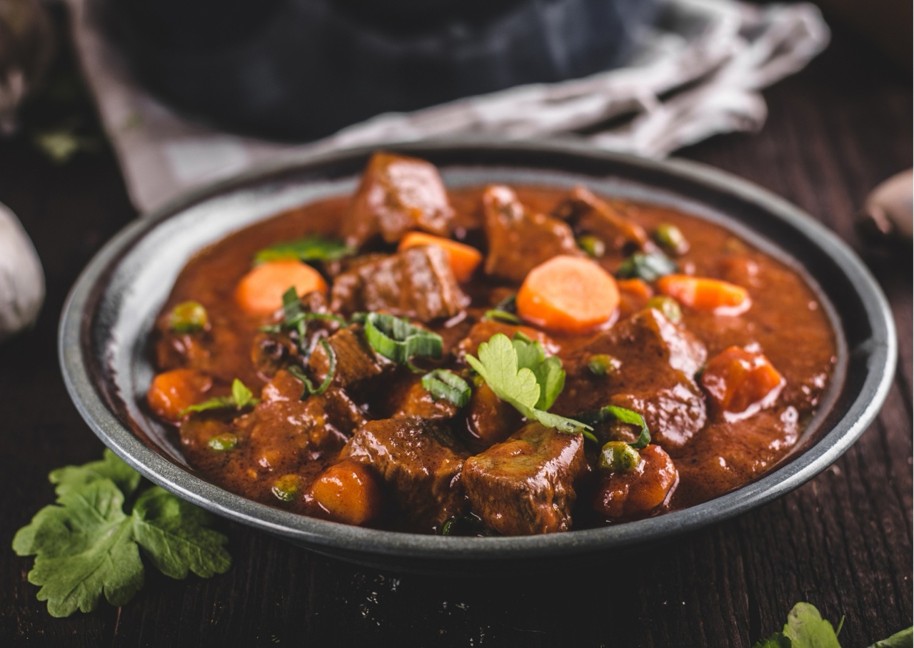 Добавьте крупно нарезанный картофель, кусочек сливочного масла, 200 мл воды, специи, сушёную петрушку и соль. Не перемешивайте. Накройте крышкой, убавьте огонь и тушите на медленном огне 40 мин. Затем добавьте свежую зелень, перемешайте и снимите с огня.