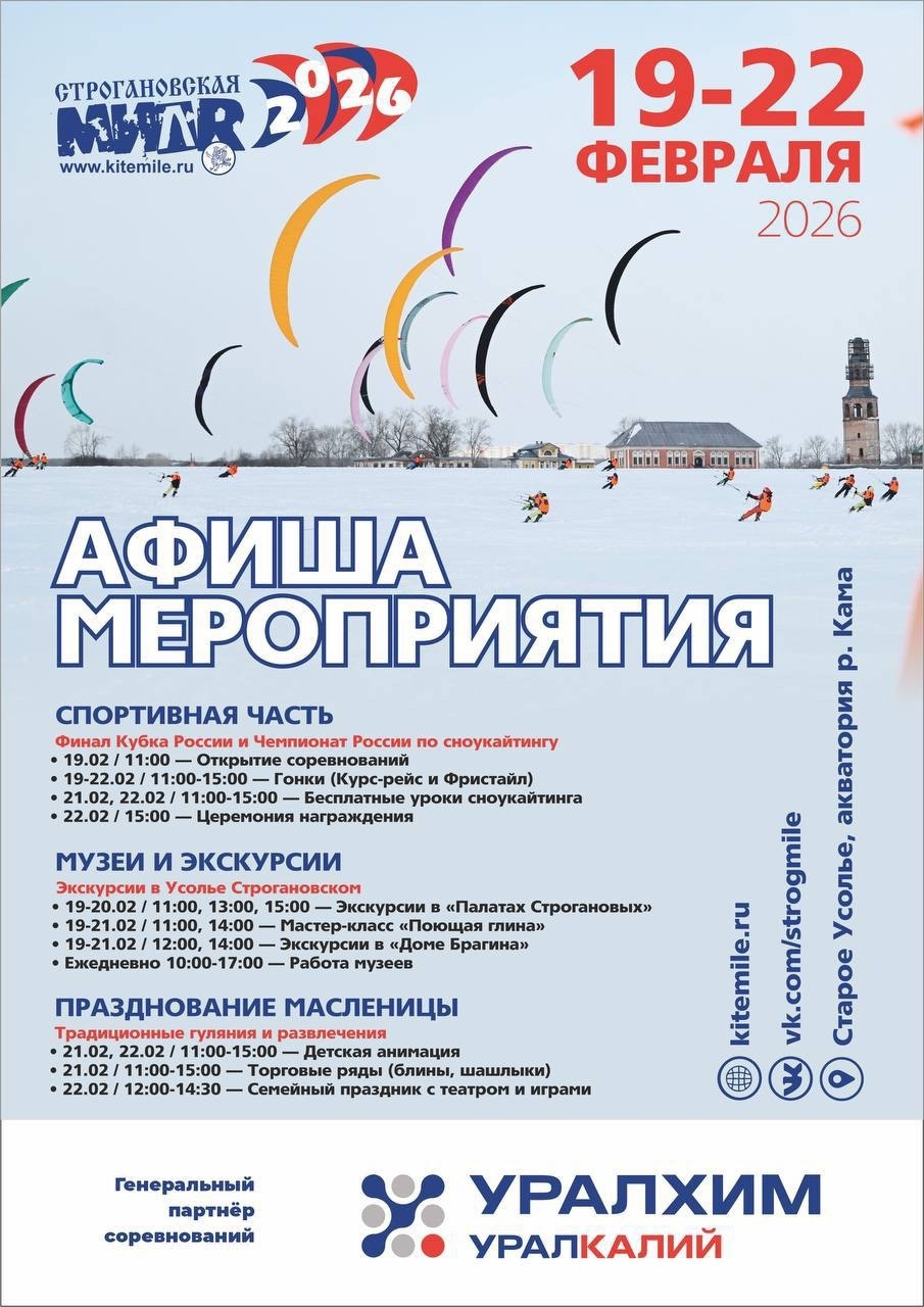 С 19 по 22 февраля на Каме в Усолье состоятся завершающие этапы Кубка России и чемпионат России по сноукайтингу. Гонки развернутся в акватории реки напротив музея «Палаты Строгановых».
