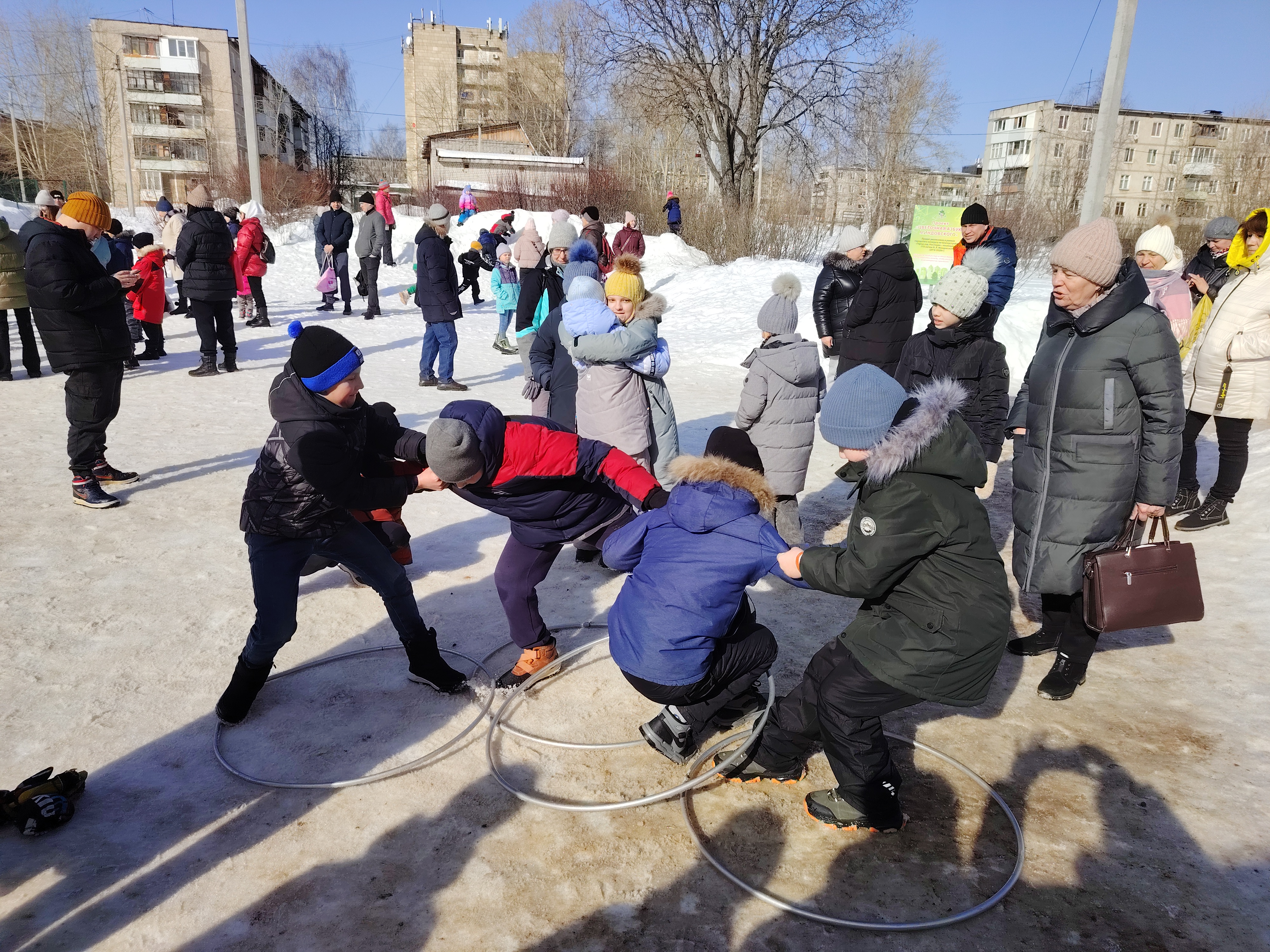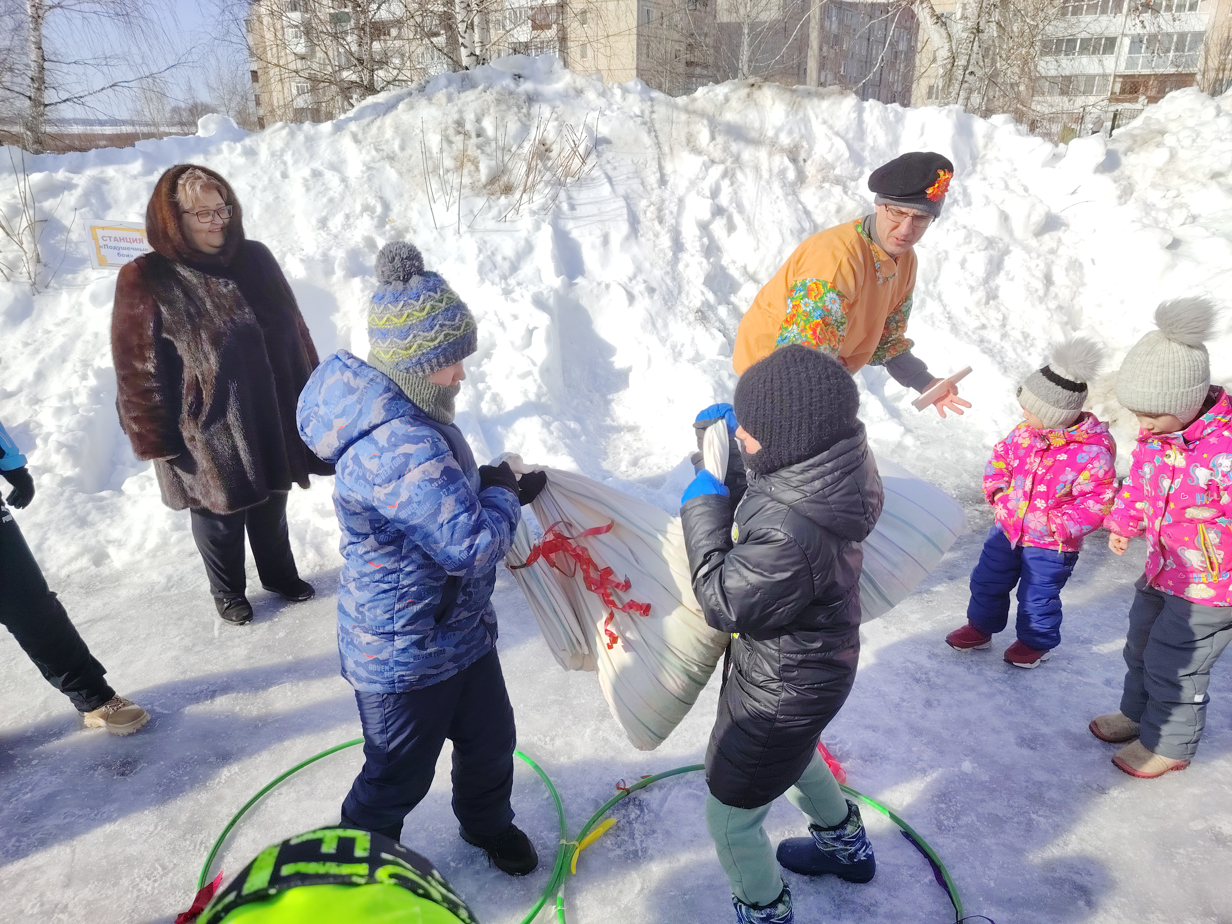 Малыши и взрослые с удовольствием участвовали в масленичных потехах, состязались в силе, ловкости и смекалке. За участие в конкурсах и соревнованиях всем давали по жетону – в конце праздника их можно было обменять на подарки.